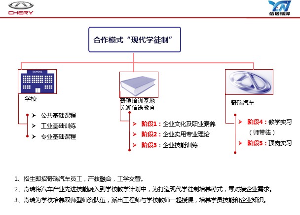 近幾年來,奇瑞汽車快速發(fā)展,對高素質(zhì)勞動(dòng)者和技術(shù)技能人才需求迫切,為滿足奇瑞公司的人才需求,奇瑞人力資源部和蕪湖信諾職校(奇瑞人才培養(yǎng)基地)經(jīng)詳細(xì)研討,制定了現(xiàn)代學(xué)徒制的校企合作模式。